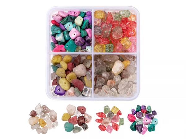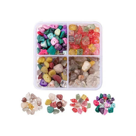 Les bijoux s’assemblent mais ne se ressemblent pas. Avec cette boîte composée de 4 compartiments de pierres précieuses éclatées naturelles et synthétiques, vous pourrez confectionner de jolis bijoux pour l’hiver comme pour l’été et laissez libre court à votre imagination pour créer les bijoux de vos rêves. N’hésitez pas à mixer ces perles naturelles avec d’autres perles plus simples ou tout simplement avec des apprêts dorés.