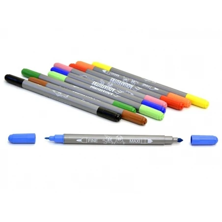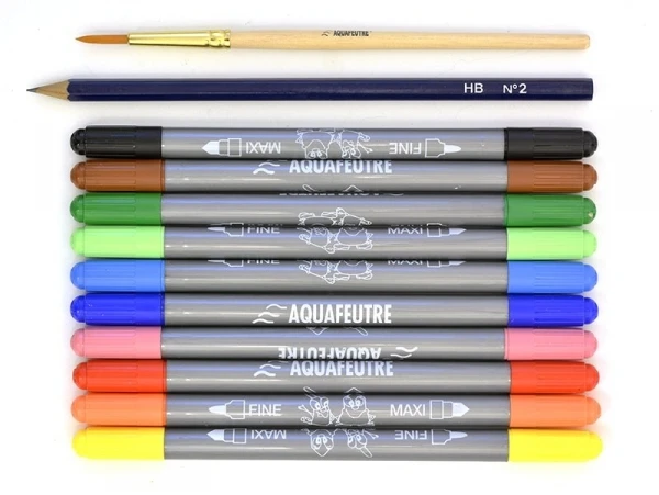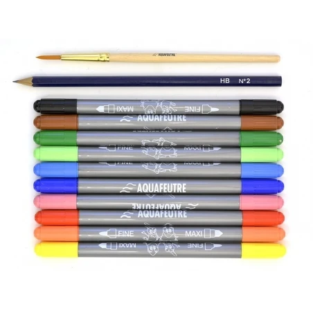 10 feutres aquarellables (avec 2 pointes résistantes), 1 pinceau, 1 crayon à papier