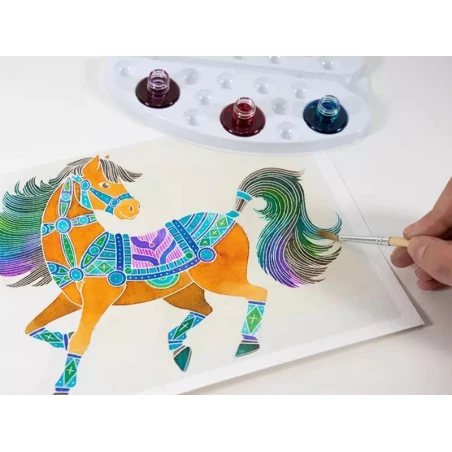 Le Coffret Aquarellum Chevaux est conçu pour initier les enfants dès 7 ans à l’art de la peinture aquarellée. Les motifs pré-imprimés offrent des lignes résistantes à l’eau, garantissant un résultat précis et harmonieux, même pour les débutants.