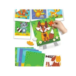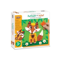 Votre enfant pourra confectionner des animaux de la forêt tout seul grâce à la simplicité du coffret. Il n’y a que trois étapes pour réaliser de jolies œuvres. Premièrement, votre enfant choisi le décor qu’il préfère. Il devra ensuite se saisir des pièces en mousse adhésive et les décoller de leur support. Il suffira ensuite de coller les pièces en mousse en les assemblant pour créer l’animal choisi parmi les cinq : un écureuil, un hibou, une biche, un renard ou encore un raton laveur ! Votre bambin choisira ensuite où il mettra son œuvre d’art, posé sur la commode de sa chambre ou sur le chevalet prévu à cet effet.