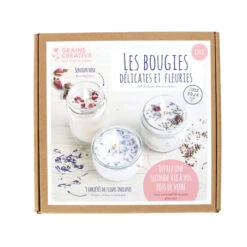 Envie de créer vos propres décorations dans une démarche éco-responsable ? Cela tombe bien ! Graine Créative a conçu un coffret pour l’ensemble des créatrices et créateurs. Le coffret Les bougies délicates et fleuries à faire soi-même permet de réaliser au moins trois bougies végétales différentes. A l’aide de la cire de soja, il vous suffira de suivre les instructions afin de créer des bougies à la douce odeur de rose.
