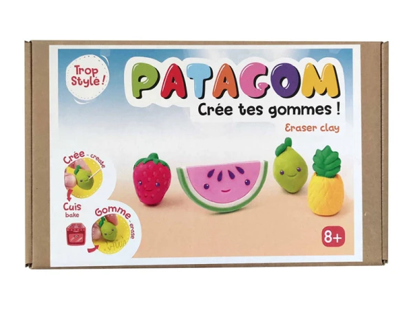 La Patagom est une pâte polymère malléable qui permet de former des personnages. Comme de la pâte à modeler, il suffit le la malaxer et de former des objets et des personnages en jouant avec les détails et les couleurs. Il est alors possible de faire des mélanges de couleurs, de créer des personnages de dessins animés ou de laisser court à son imagination. Des petits yeux pour rendre le tout plus mignon et c’est prêt à passer au four ! Après cuisson, réalisée par un adulte, votre enfant sera heureux de découvrir ses gommes figées et prêtes à être utilisées pour gommer ou tout simplement en décoration. Les enfants adorent collectionner ses jolies petites gommes si Kawai !