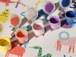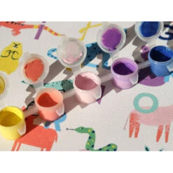 Vous disposerez d’une affiche divisée en différentes parties comportant chacune un numéro bien précis. Ce numéro correspond à la peinture à utiliser pour remplir cette parcelle blanche. Vous n’avez plus qu’à utiliser un des deux pinceaux fournis dans le coffret et peindre l’espace correspondant à la couleur. A vous de compléter toutes les parties afin de découvrir la jolie illustration colorée. Pour vous aider, une planche de stickers numérotés a été glissée dans ce coffret, vous n’avez plus qu’à les coller sur chaque petit pot de peinture pour ne pas vous mélanger les pinceaux avec les couleurs.