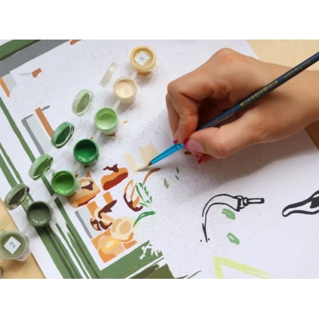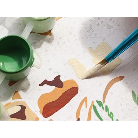 Dans votre coffret Petit Pinceau, vous disposez d’une illustration sur papier épais blanc dont les différentes couleurs sont représentées uniquement par un numéro bien précis. Chaque zone est numérotée et doit être remplie avec la couleur correspondante. Vous n’avez plus qu’à utiliser un des deux pinceaux fournis dans le coffret et peindre l’espace correspondant à la couleur selon votre préférence d’épaisseur. Pour vous aider, une planche de stickers numérotés a été glissée dans ce coffret, vous n’avez plus qu’à les coller sur chaque petit pot de peinture pour ne pas vous mélanger les pinceaux avec les couleurs. Vous découvrirez au fur et à mesure la jolie illustration colorée d’une manière si satisfaisante ! Prenez ce temps pour détendre et vous offrir une bulle de bien être. L’artiste c’est vous !