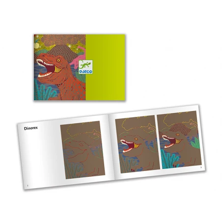 Une pochette de 4 cartes à gratter aux reflets dorés sur l’univers fascinant des dinosaures. L’enfant reproduit les motifs imaginés par l’artiste en grattant la surface à l’aide du stylet en bois. Petit à petit, les dinosaures prennent vie dans leur décor ! 6-10 ans – years