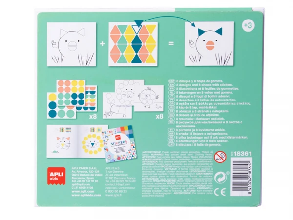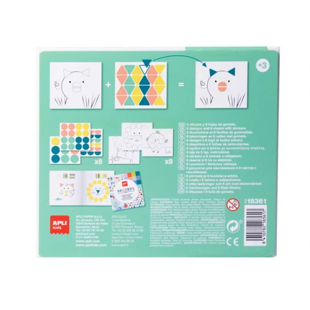 Jeux de gommettes modèles animaux dans une boĂ®te en carton. L’objectif du jeu est de complĂ©ter les dessins Ă l’aide des diffĂ©rentes gommettes gĂ©omĂ©triques. L’ensemble comprend : 8 fiches illustrĂ©es de 200g avec une finition mate Ă complĂ©ter avec des gommettes, 8 feuilles de gommettes gĂ©omĂ©triques enlevables de couleurs diffĂ©rentes et une notice avec des exemples de couleurs. Les gommettes enlevables permettent Ă l’enfant de corriger en cas d’erreur. Ce jeu, dĂ©veloppĂ© avec le soutien de pĂ©dagogues, une grande valeur didactique contient : il stimule la motricitĂ© fine, dĂ©veloppe la pensĂ©e mathĂ©matique, aide Ă la concentration, travaille sur le dĂ©veloppement de l’Ĺ“il manuel et privilĂ©gier l’orientation spatiale. Produit avec une prĂ©sentation originale et un design attrayant : boĂ®te en carton au design exclusif APLI Kids.