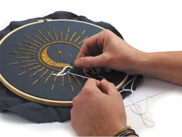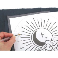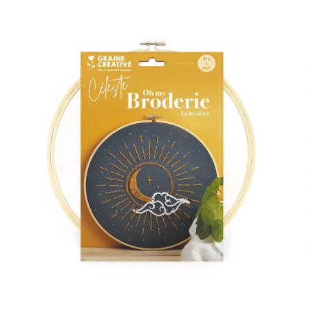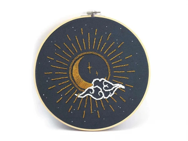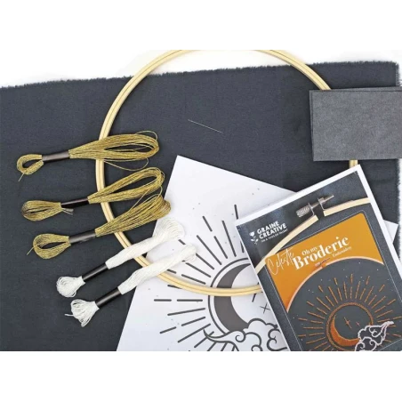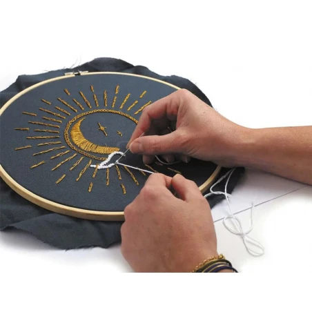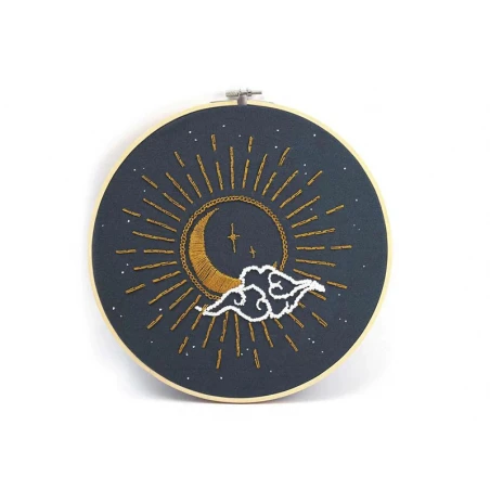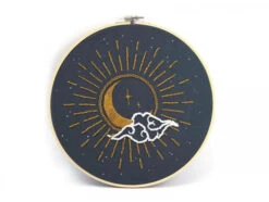 La décoration habille un intérieur et reflète la personnalité de son hôte. Avec ce kit de broderie décorative, personnalisez encore plus votre intérieur en réalisant cette broderie représentant un soleil et une lune unis. Ce kit vous permet de réaliser, étape par étape, ce modèle avec tout le matériel nécessaire. Sur ce kit de broderie, vous pourrez broder un immense soleil et une lune en son sein. Un nuage et des étoiles sont à ajouter autour pour terminer cette broderie.