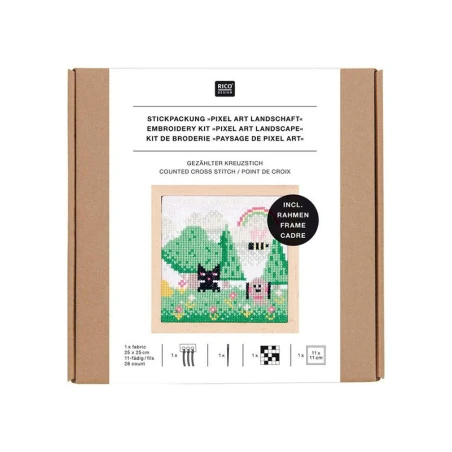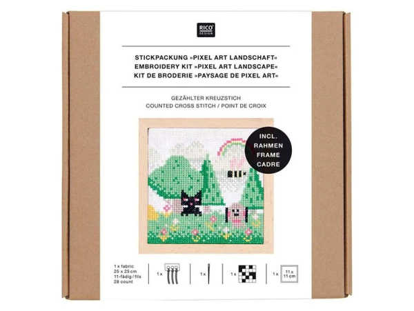 Créez une magnifique scène champêtre avec le Kit de Broderie Point de Croix Pixel Art de Rico Design. Ce kit vous permet de réaliser un paysage apaisant, où un charmant chat noir se repose au cœur d’une campagne verdoyante. Inspiré par l’esthétique du pixel art, ce décor moderne et stylisé apportera une touche de fraîcheur et de créativité à votre intérieur.