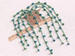 Les motifs de cette broderie ont été crées par Miriam Polak. Pour réaliser l’ouvrage, divers points de broderie sont utilisés : point de tige, point de satin, nœud et optique de point tissé. Il faut donc s’y connaître un peu avant de débuter ce kit.