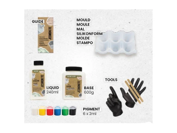 La Jesmonite est un composant utilisĂ© dans la rĂ©alisation d’objets dĂ©coratifs en rĂ©sine. Ce composant se constitue de deux ingrĂ©dients principaux : un liquide acrylique aqueux et une base minĂ©rale composĂ©e de gypse (aussi appelĂ© pierre Ă plâtre). Pour obtenir la prĂ©paration qui vous permettra de crĂ©er vos objets, vous devrez mĂ©langer ensemble le liquide et la base minĂ©rale selon les doses indiquĂ©es. Une fois bien mĂ©langĂ©e, la prĂ©paration devra ressembler Ă une pâte Ă©paisse et facile Ă couler.