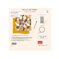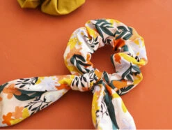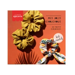 Cette box crĂ©ative contient tous les Ă©lĂ©ments nĂ©cessaires pour confectionner de jolis chouchous ainsi qu’un foulchie fleuri.