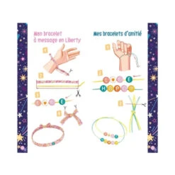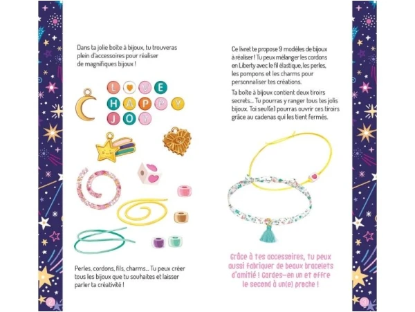 Ce coffret est un enchantement pour les enfants. Sa jolie décoration céleste et ses compartiments bien pensés en font un espace parfait pour organiser ses bijoux et créations tout en ajoutant une touche magique à sa chambre. Non seulement les enfants peuvent y ranger leurs accessoires avec soin, mais ils ont aussi tout le nécessaire pour réaliser leurs propres bijoux ! Le coffret comprend en effet divers accessoires pour concevoir des bracelets, colliers et bagues selon l’inspiration du moment. Un vrai plaisir pour les petites mains créatives !