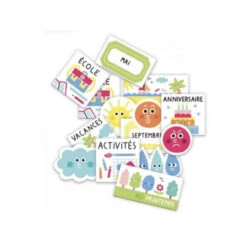 Cette boîte comprends : 29 aimants représentant des vignettes pour l’école, les activités, les anniversaires. D’autres aimants pour décrire la journée comme l’humeur, la saison, la météo. Mais également, un grand poster à accrocher sur une surface métallique qui correspond au planning.