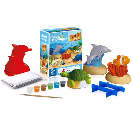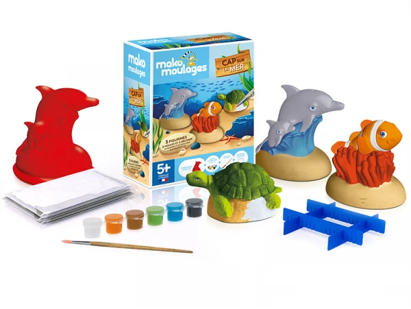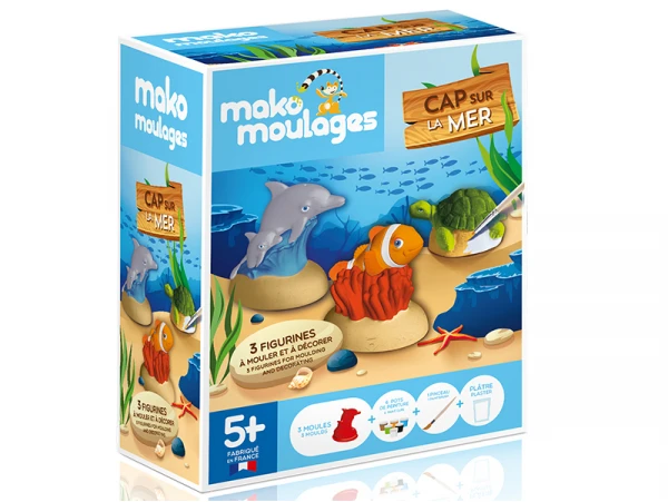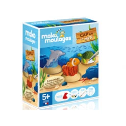 Avec ce kit créatif mako moulages, moule et décore trois animaux emblématiques de la mer : le dauphin et son petit, la tortue et le poisson clown ! Avec trois doses unitaires de plâtre prédosées, pour trois moules. On dirait que la marque a pensé à tous les détails. Si un enfant est à proximité du kit, il va souhaiter tout faire dans la minute. En attendant que cela cuise, nous vous suggère de lui réfléchir déjà aux décorations. Pour se faire, on lui donne tout le matériel nécessaire (peinture) pour réaliser le paysage marin de ses rêves !