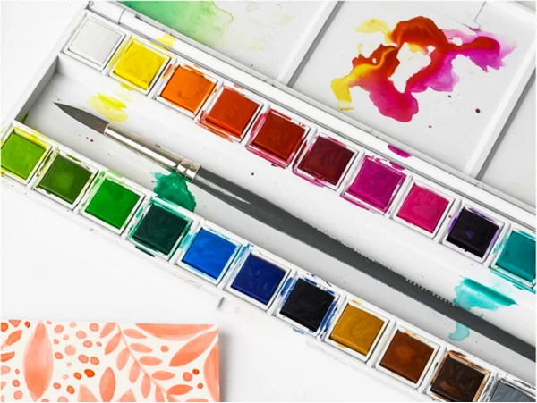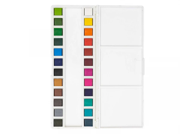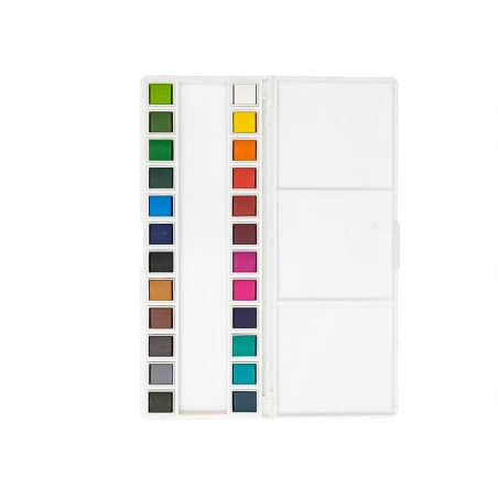 Une grande palette de 24 demi-godets d’aquarelle, pratique et facile à transporter.