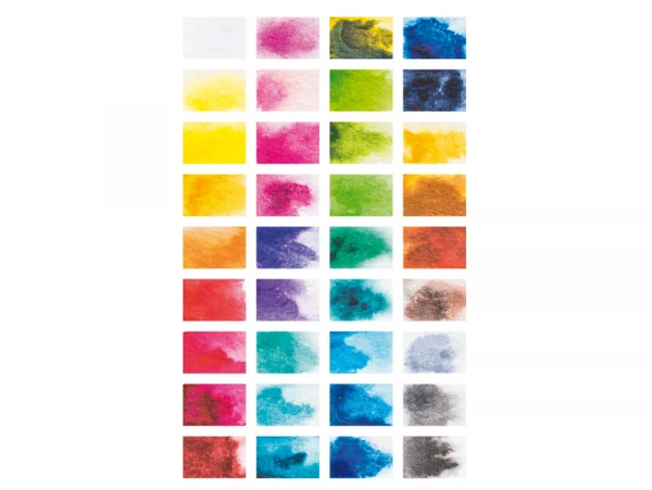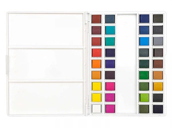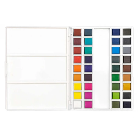 Une grande palette de 36 demi-godets d’aquarelle, pratique et facile à transporter.