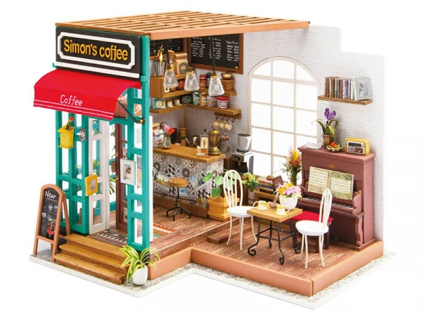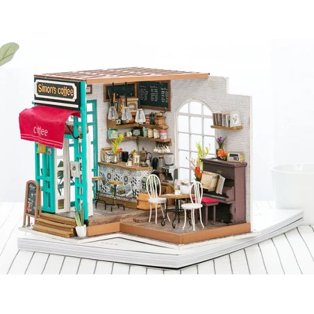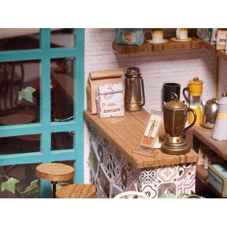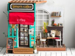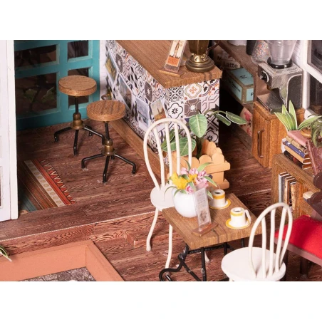 Qui ne craquerait pas devant ce petit café vintage miniature ? Les petites tasses, les couleurs et les petits détails font tout le charme de ce café qui s’illumine ! Ce café de Simon, de la marque Robotime Rolife, va vous transporter dans un univers vintage plein de douceur. Mais avant d’en arriver ici, patience et rigueur vont être de mises pour construire entièrement ce café aux touts petits éléments.