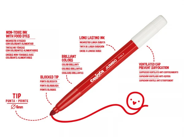 Ce set se compose de 12 feutres Jumbo octogonaux à l’encre ultra lavable, non toxique, entièrement produite en utilisant des colorants alimentaires (sans gluten) et est dermatologiquement testĂ©e. Chaque crayon possède une pointe bloquĂ©e de 6mm et un bouchon ventilé anti-Ă©touffement pour encore plus de sĂ©curitĂ©.Â